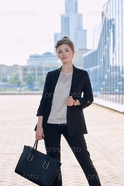Молодая элегантная бизнес-леди в умной повседневной одежде, держащая черную кожаную сумочку