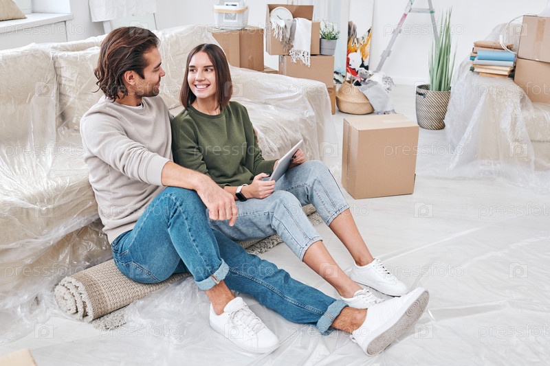 Красивая молодая жена смотрит на своего супруга, консультируясь о новой мебели
