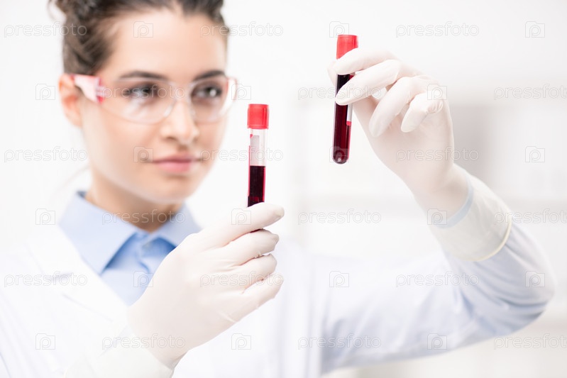 Современная женщина-клиницистка в перчатках, держащая образцы новой вакцины
