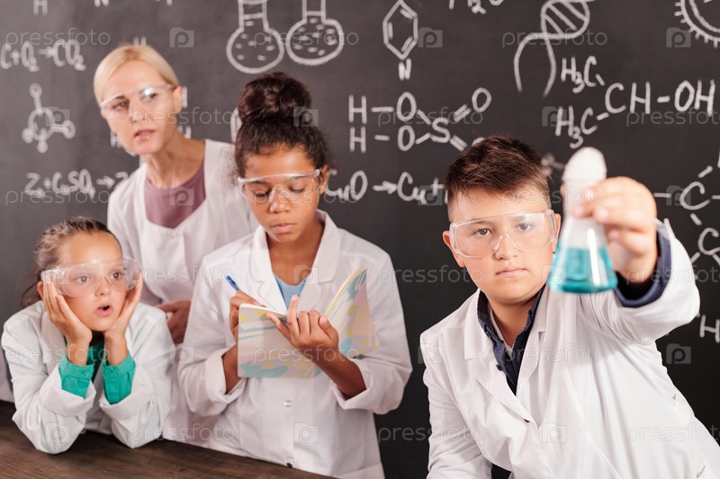 Блондинка-учительница и две интеркультурные школьницы смотрят на химическую реакцию