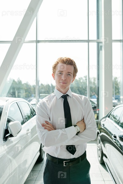 Молодой уверенный мужской дилер автоцентра, стоящий между двумя новыми автомобилями