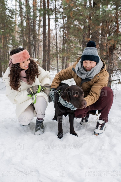 Молодые девушки в зимней одежде сидят на приседаниях, играя с черным ретривером