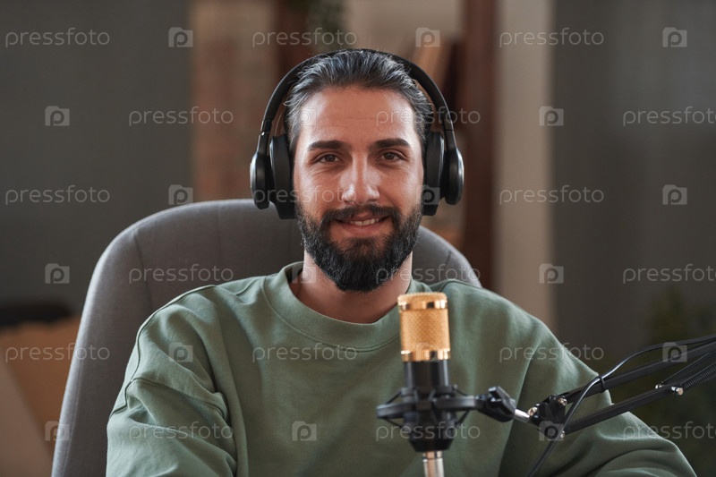 Средний крупный портрет молодой ближневосточной влиятельной личности с наушниками, создающей контент для блога и смотрящей на камеру