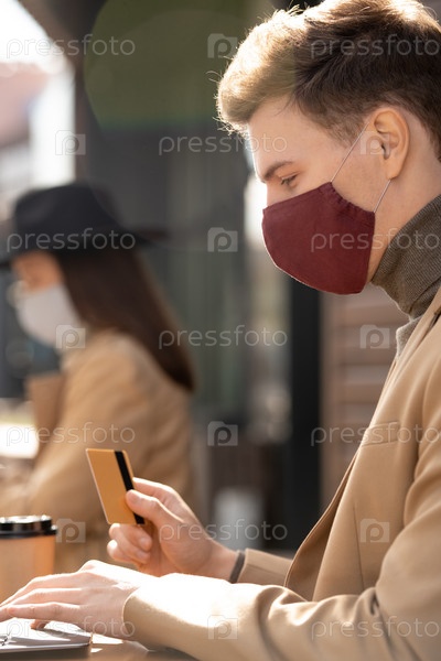 Боковой вид молодого элегантного бизнесмена в защитной маске, покупающего онлайн