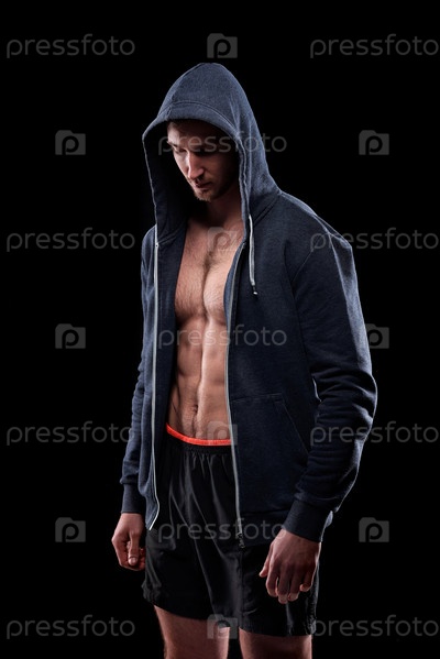 Молодой спортсмен в шортах и расстегнутой толстовке стоит перед камерой