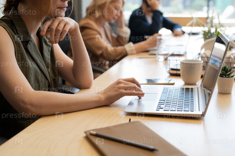 Молодая офисная работница готовит презентацию о серфинге в сети