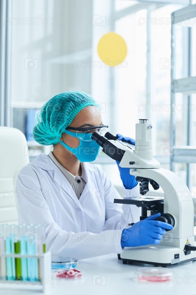 Исследовательница смотрит под микроскопом