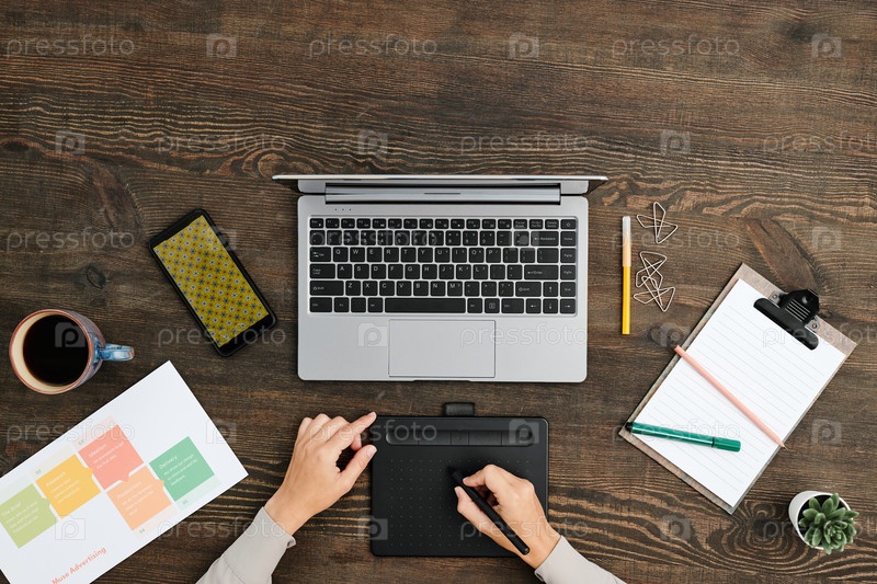 Флатлей рук современной женской креативной дизайнерки, ретуширующей изображения