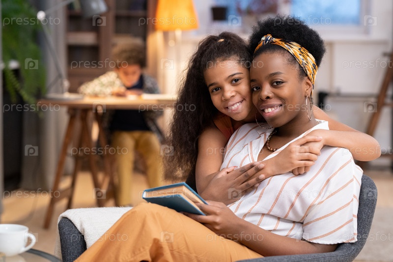 Счастливая африканская девочка с зубчатой улыбкой обнимает свою мать, сидящую в кресле