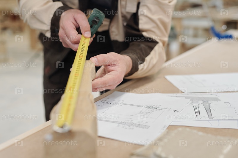 Руки современного рабочего завода, измеряющего длину деревянной заготовки