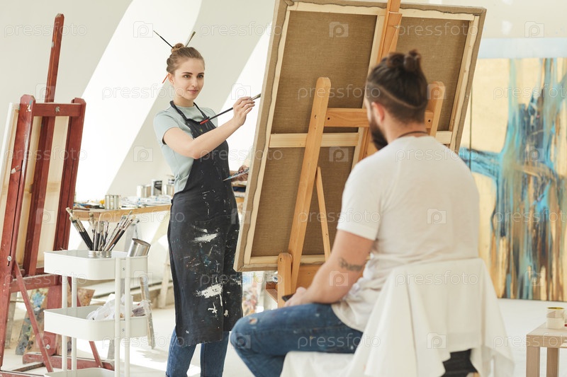 Молодая художница рисует портрет в студии