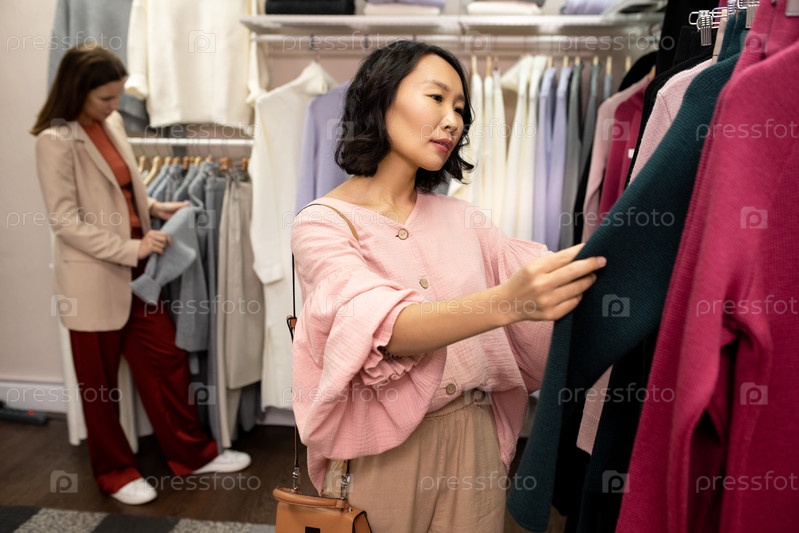 Молодая азиатская женщина-клиент в розовой умной блузке ищет новый свитер