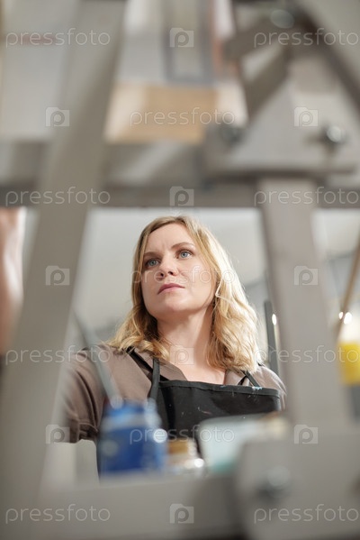 Молодая блондинка-серьезная художница в фартуке, работающая над незавершенной картиной
