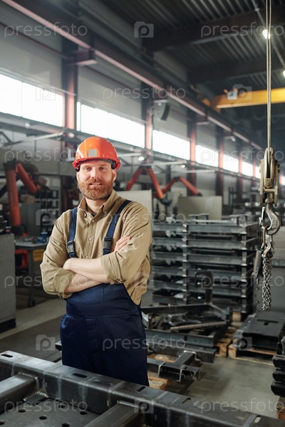 Молодой успешный инженер с пересеченными руками смотрит на вас внутри промышленного завода