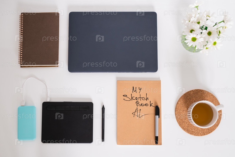 Плоский макет напитка, цветов, эскизной тетради, блокнота со стилусом, блокнот и ноутбук