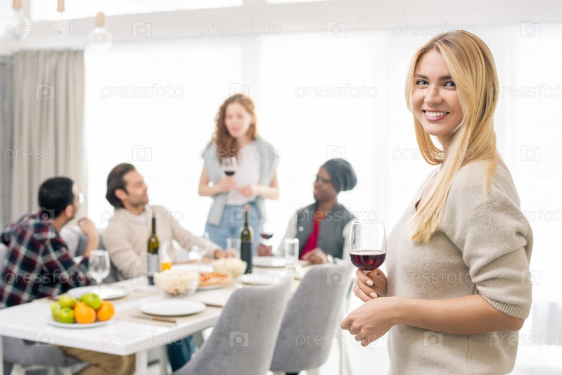 Молодая улыбающаяся женщина со стаканом вина на фоне межкультурных друзей