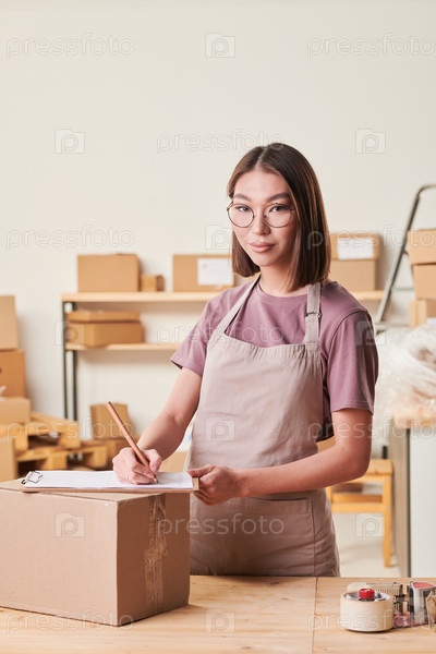 Портрет содержимого молодой азиатский складской работник в очках и фартуке, стоящий за столом с пакетом и певческими бумагами