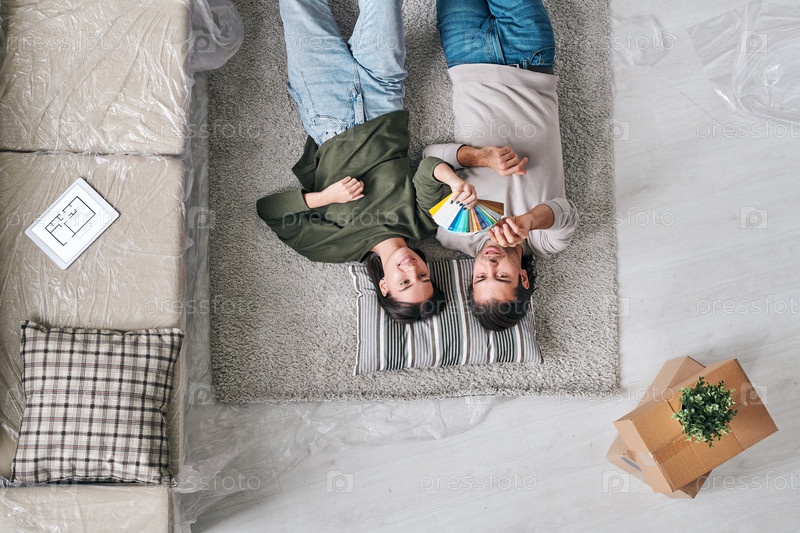 Обзор молодой расслабленной пары, отдыхающей на полу новой квартиры или дома