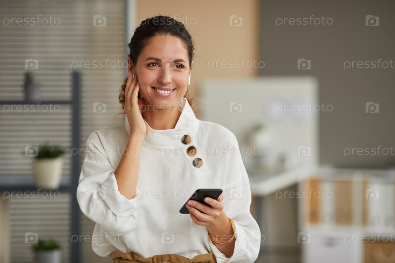 Улыбающаяся деловая женщина использует беспроводные наушники