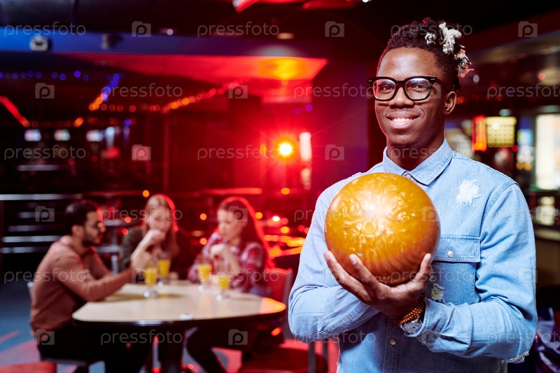 Счастливый молодой африканский мужчина с мячом для боулинга стоит перед камерой