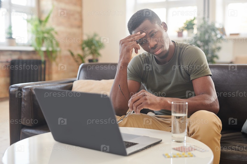 Молодой взрослый афроамериканский мужчина, сидящий за столом перед ноутбуком с очками в руках и страдающий от сильной головной боли