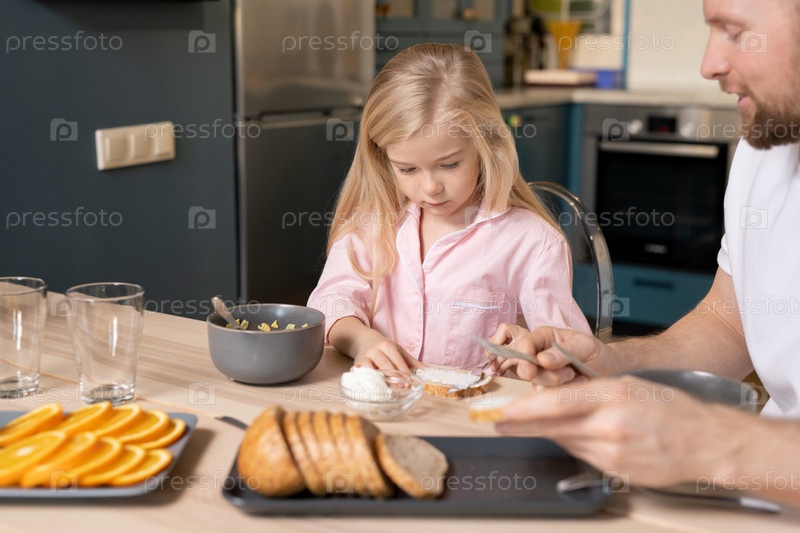 Красивая блондинка, рассыпающая масло на кусочек пшеничного хлеба к завтраку