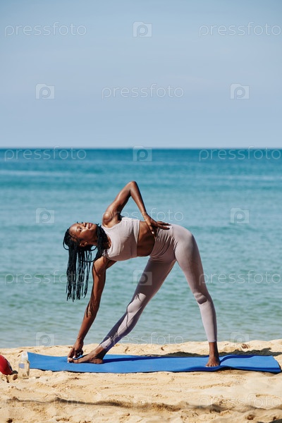 Спортсменка делает позу длинного треугольника