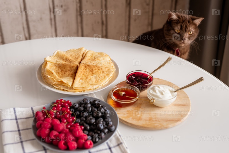 Коричневый домашний кот сидит за кухонным столом с свежей едой на завтрак