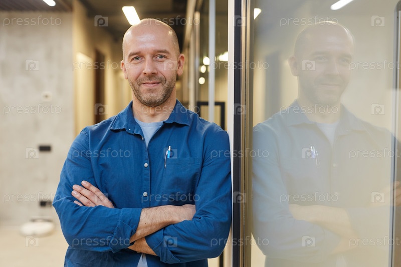 Взрослый лысый мужчина позирует уверенно