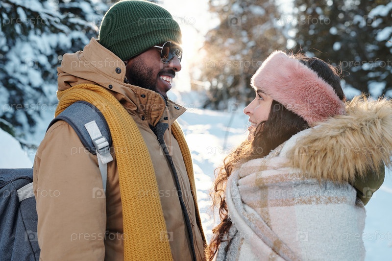 Любящие молодые межкультурные свидания в зимней одежде смотрят друг на друга