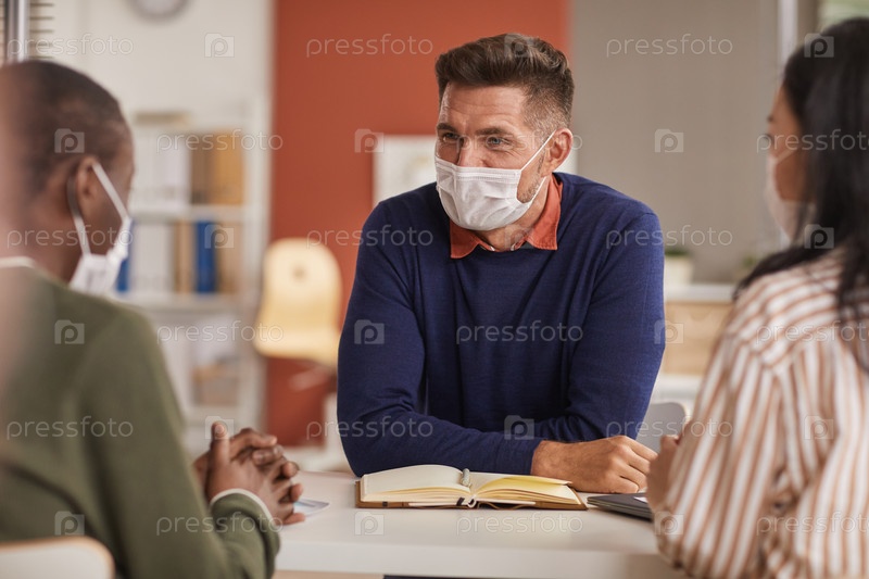 Люди, носящие маски на деловых встречах