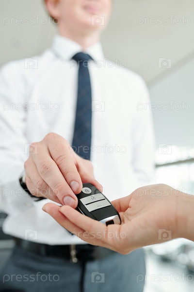 Молодой элегантный менеджер по продажам отдает пульт дистанционного управления в руки покупательницы