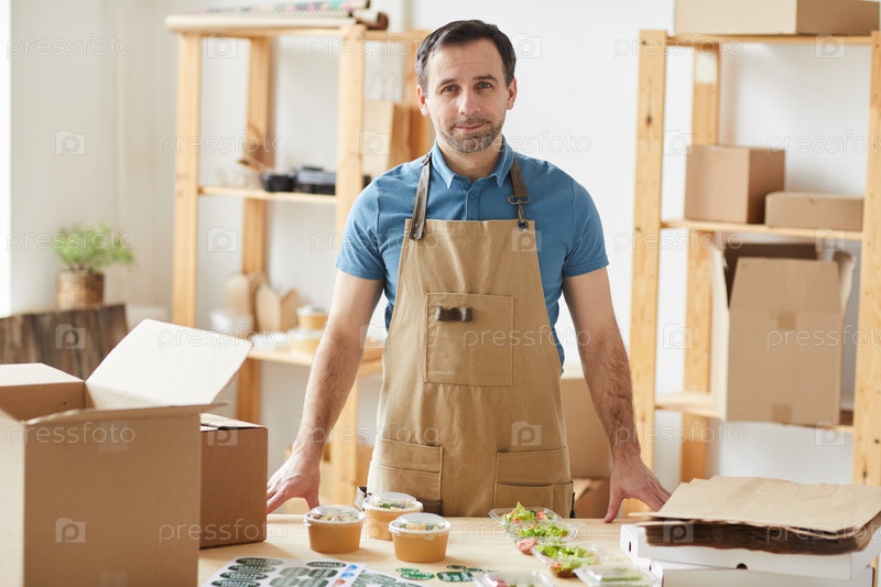 Улыбающийся работник службы доставки еды