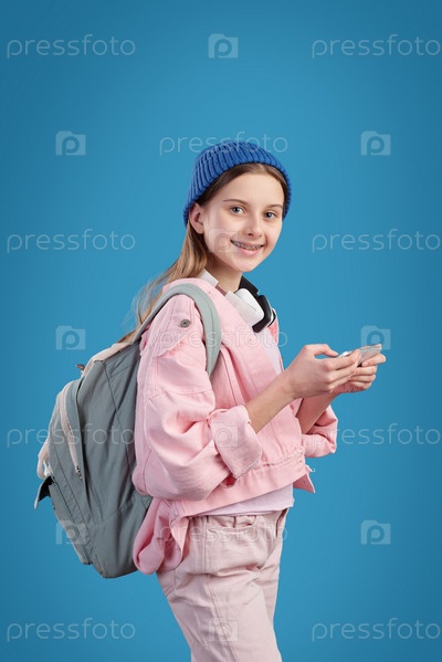 Случайная умная девочка-подросток с рюкзаком и мобильным гаджетом ходит в школу
