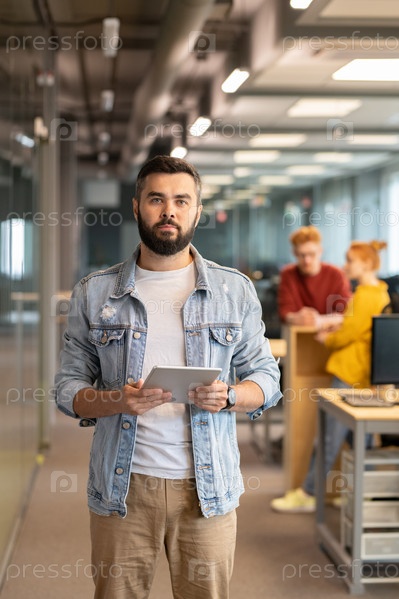 Молодой серьезный бизнесмен в повседневной одежде стоит перед камерой в офисе