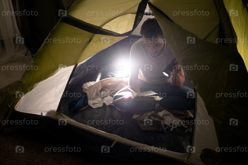 Молодой человек читает в темноте
