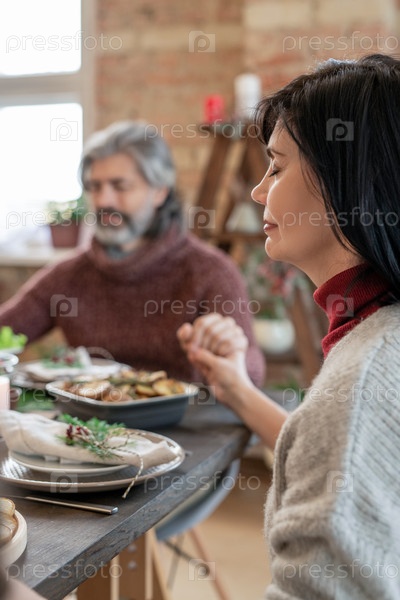 Руки зрелой женщины и бородатого мужчины с закрытыми глазами молятся перед ужином