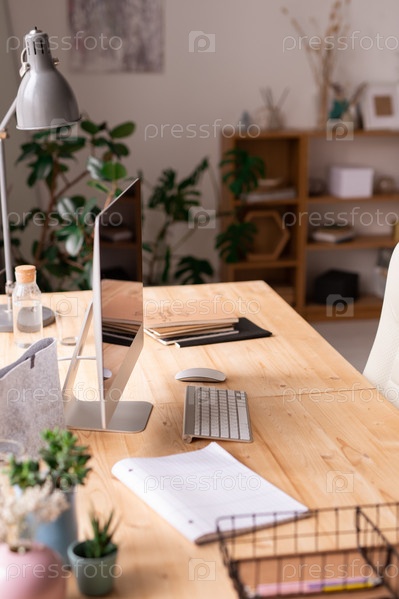 Деревянный стол с монитором компьютера, лампой, клавиатурой, документами и другими вещами