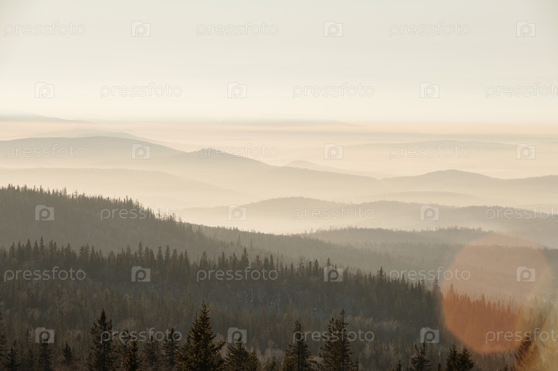 Прекрасный вид на природу в морозное зимнее утро с туманом, покрывающим горы