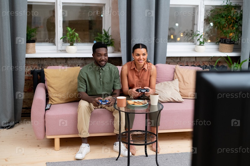 Счастливый подросток и девочка африканской этнической принадлежности играют в видеоигры дома