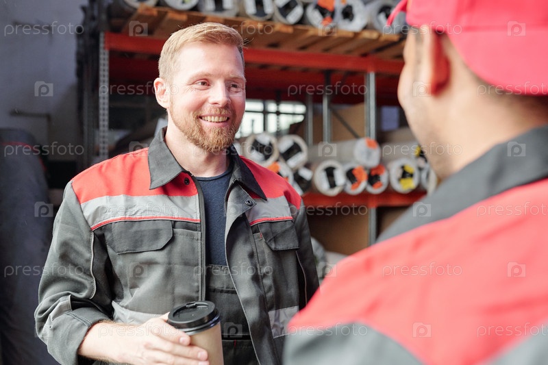 Улыбающийся работник в форме пьет кофе во время разговора с коллегой