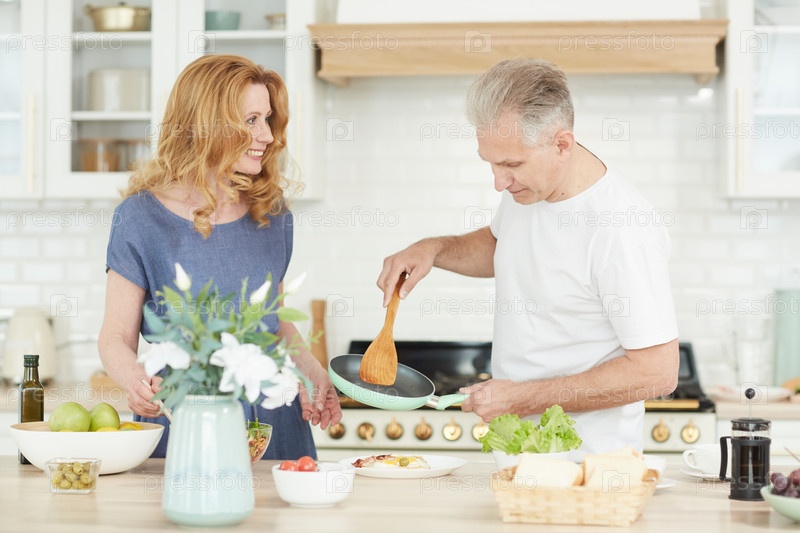 Улыбающаяся взрослая пара, готовящая вместе