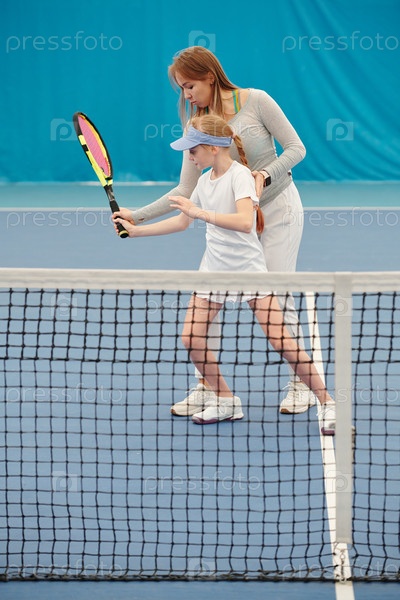 Молодая теннисная тренерка держит ракетку в руке девушки, консультируясь с ней