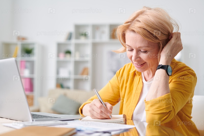 Красивая блондинка-бизнесвумен в повседневной одежде планирует работу или делает заметки