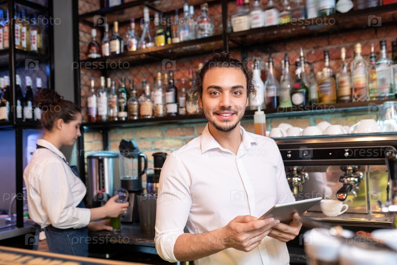 Молодой веселый официант с сенсорным панелем стоит перед камерой
