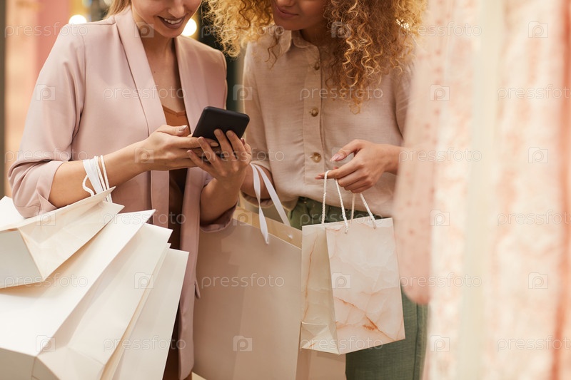 Две молодые женщины используют смартфон в бутике