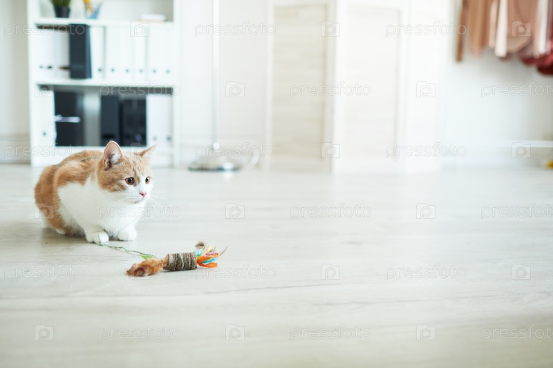 Кошка с игрушкой на полу