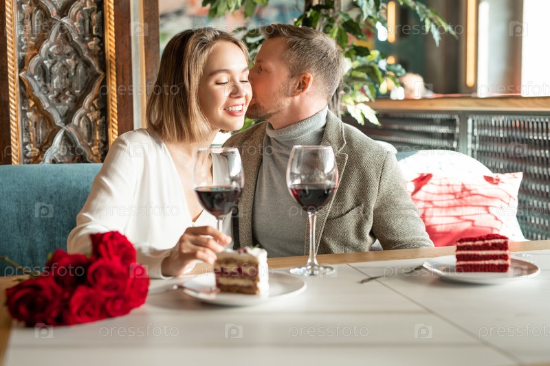 Молодой человек шепчет что-то в ухо своей девушке возле обеденного стола