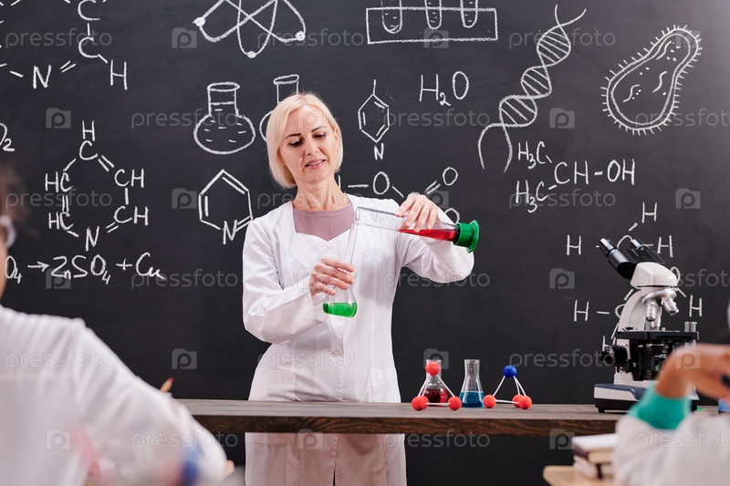Молодая самоуверенная учительница химии в белом халате наливает красную жидкость