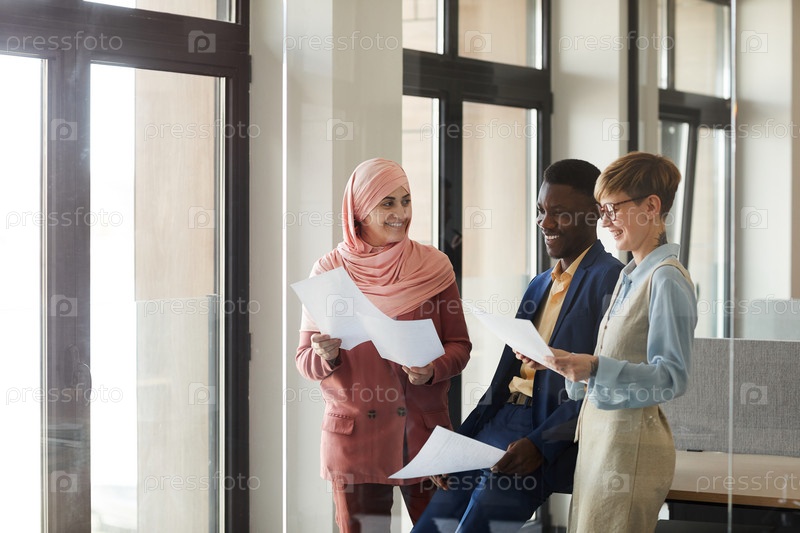 Молодая многоэтническая бизнес-команда смеется в офисной вестибюле